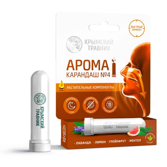 “Арома-карандаш №4» – это сочетание природных растительных компонентов и эфирных масел, которые служат естественной поддержкой организма в повседневных ситуациях нервного напряжения или раздражения при бессоннице и неврозах. В состав эфирного масла грейпфрута входят биофлавоноиды, известные своими повышающими иммунитет свойствами и помогающие организму бороться со свободными радикалами. Наряду с антимикробными свойствами масло способствует укреплению здоровья и защите от различных заболеваний.
