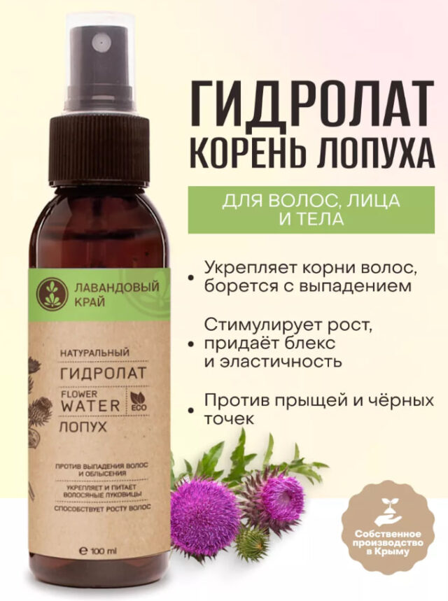 Представляем гидролат от ТМ Лавандовый край — это невероятно полезное и природное средство для ухода за вашей кожей и волосами. Этот натуральный продукт, полученный путем паровой дистилляции корня лопуха, обладает множеством полезных свойств. Благодаря своим антисептическим свойствам, очищающий тоник помогает бороться с различными воспалениями и высыпаниями на коже, успокаивает раздражения и ускоряет процесс заживления, помогает в борьбе с акне и прыщами на лице и теле. Он также способствует нормализации работы сальных желез, поэтому идеально подходит для проблемной, комбинированной и жирной кожи женщин, мужчин и подростков, в том числе на голове. Органический экстракт также рекомендуется использовать в качестве увлажняющего спрея для сухих, поврежденных и нормальных волос. Он помогает в укреплении корней, предотвращает выпадение, облысение и стимулирует рост, а также придает блеск, гладкость, эластичность и объем. Эффективен от перхоти, себореи. Оригинальная уходовая крымская косметика от ТМ Лавандовый край – это гарантия качества, безопасности и эффективности.