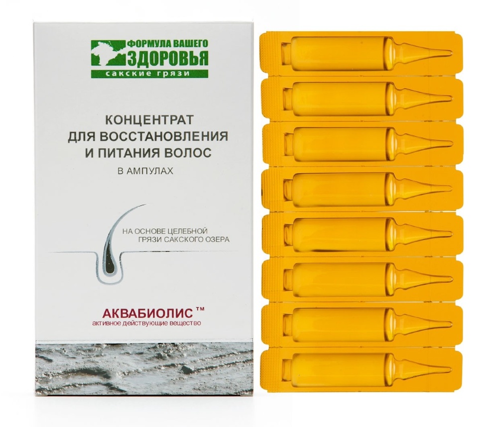 Концентрат для восстановления и питания волос в ампулах содержит в составе активное действующее вещество АКВАБИОЛИС – вытяжка из грязи Сакского озера. Благодаря АКВАБИОЛИСУ замедляется процесс старения фолликулов, предотвращая выпадение волос. Усиливает микроциркуляцию крови в волосяных фолликулах, стимулируя рост волос, обеспечивает интенсивное увлажнение и питание кожи головы, придает волосам силу и блеск. АКВАБИОЛИС в комплексе с растительными компонентами насыщает кислородом волосяные фолликулы и укрепляют волокна волос, способствуя им быть более здоровыми, блестящими, густыми.