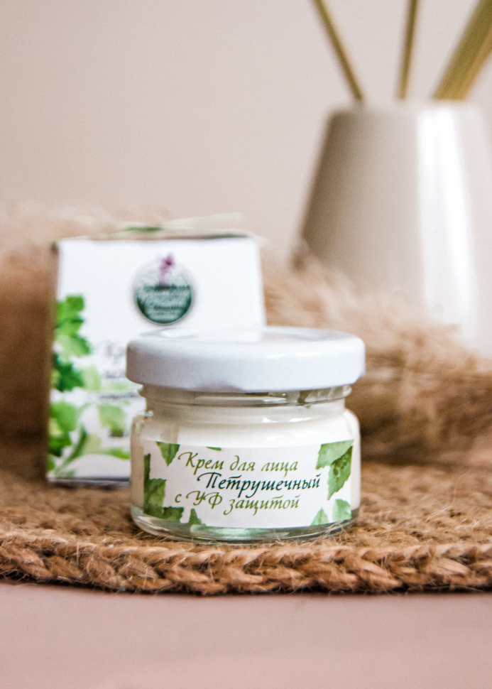 Действие крема направлено на осветление кожи, выравнивание цвета лица, и параллельно на легкую 3ащиту от ультрафиолетового излучения в условиях города. Может использоваться как основа под макияж! Подходит для ежедневного использования. В креме используются натуральные масляные экстракты ромашки и петрушки, которые обладают не большим, но естественным фактором защиты от солнца, а также минеральный УФ фильтр — оксид цинка.Крем на основе гидролата петрушки продлевает молодость, питает кожу всеми необходимыми ей полезными веществами, обладает отбеливающим и подтягивающим эффектами.