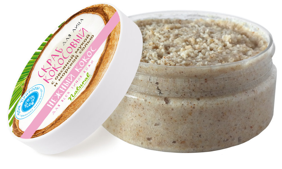 Состав: мука овсяная, стружка кокосовая молотая, соль морская, масло кокосовое, масло миндальных косточек, глицерил моностеарат, кокоглюкозид, лецитин, глицерин, янтарная кислота, масло ши, экстракт кокоса, кокосовые сливки, каприк/каприлик триглицерид, сорбитан каприлат, витамин Е.