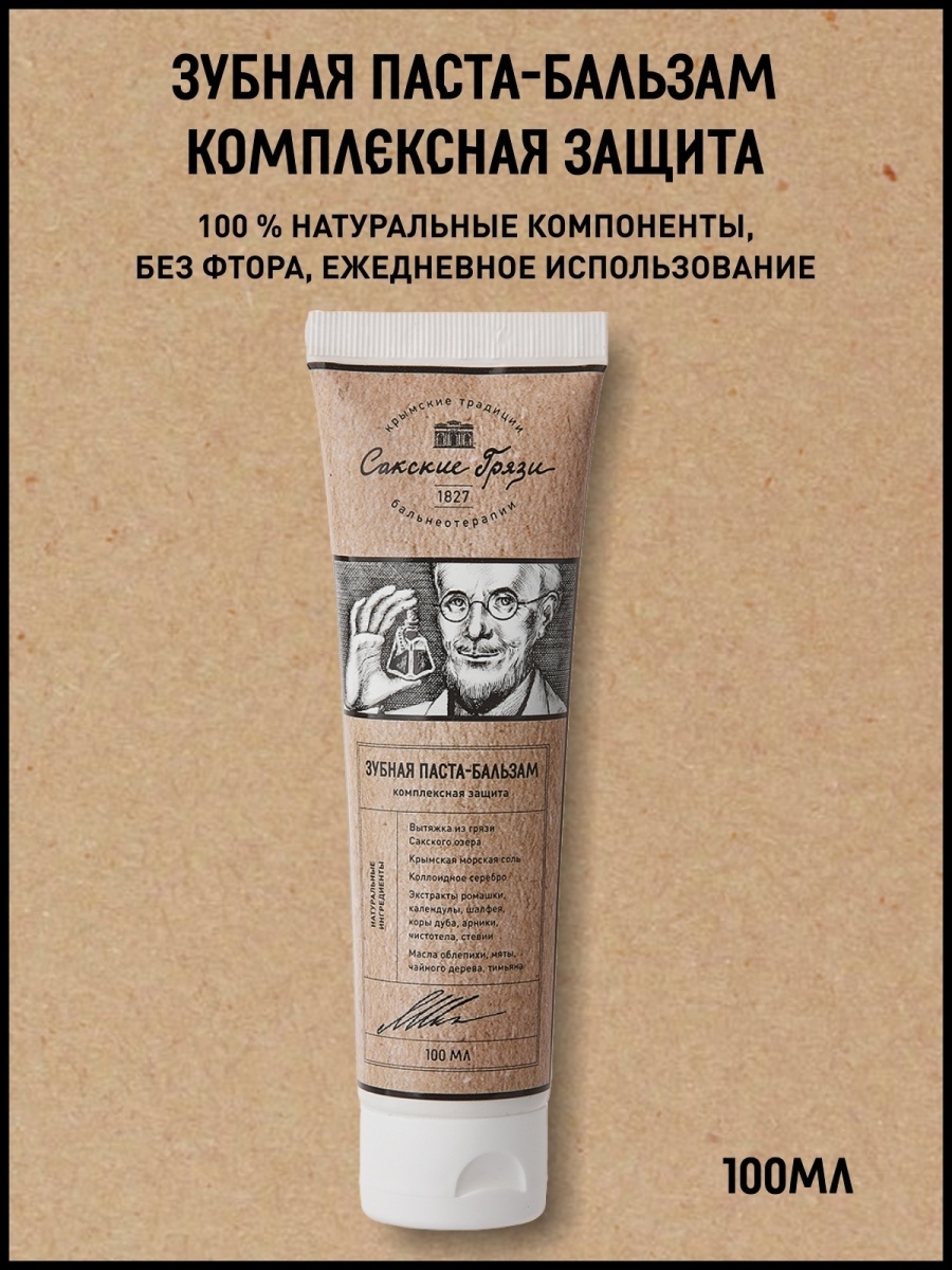 Зубная паста — бальзам «Комплексная защита» — это НАТУРАЛЬНОЕ СРЕДСТВО для профилактики кариеса и заболеваний пародонта с уникальным составом, содержащий: — ВЫТЯЖКУ ИЗ ГРЯЗИ САКСКОГО ОЗЕРА — редчайшая комбинация органических веществ, минералов и микроэлементов, стимуляция регенеративных процессов в тканях. КРЫМСКАЯ МОРСКАЯ СОЛЬ — природный антисептик. КОЛЛОИДНОЕ СЕРЕБРО — дезинфицирование и препятствие образования зубного налёта. Комплекс ЭКСТРАКТОВ РОМАШКИ, КАЛЕНДУЛЫ, ШАЛФЕЯ, ЧИСТОТЕЛА, КОРЫ ДУБА, АРНИКИ, СТЕВИИ — комплексное антибактериальное, противовоспалительное, укрепляющее действие, предохранение эмали зубов от разрушения. ЭФИРНЫЕ МАСЛА ОБЛЕПИХИ, МЯТЫ, ЧАЙНОГО ДЕРЕВА, ТИМЬЯНА — устранение неприятного запаха изо рта, Благодаря своему уникальному составу, зубная паста — бальзам «Комплексная защита» бережно отбеливает и укрепляет зубы, оказывает антибактериальное и противовоспалительное действие, образует защитный слой на поверхности чувствительных участков зубов.